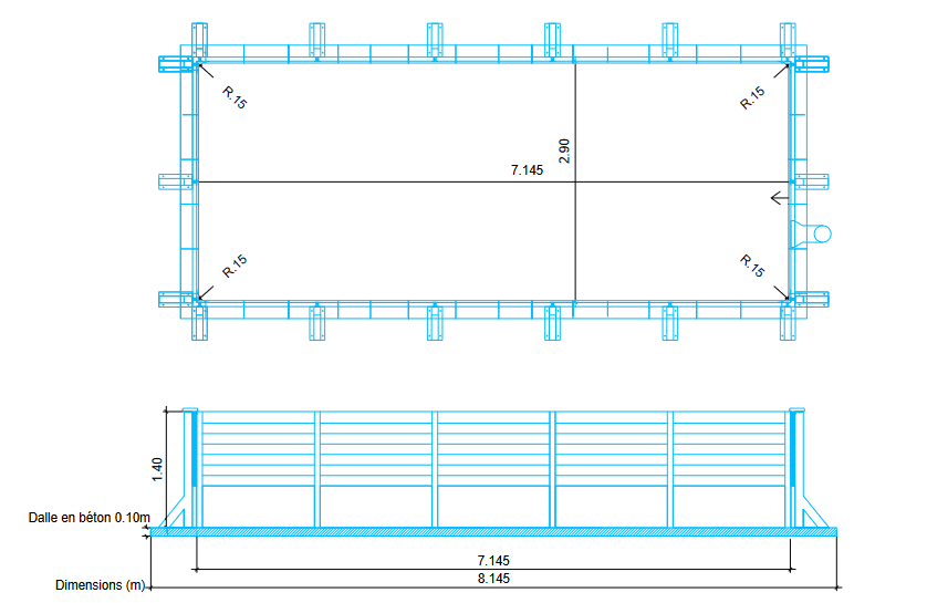 Sa structure est entièrement en béton, avec des traverses robustes et des piliers, renforcée par une margelle en béton teinté et un renfort intérieur de 4 mm, assurant solidité et durabilité.